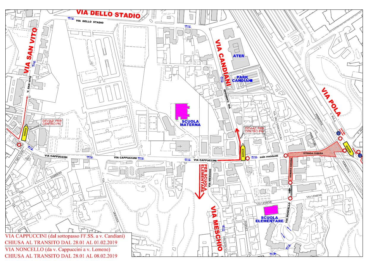 E' scattata la chiusura per sette giorni circa di via Cappuccini dal sottopasso ferroviario all’imbocco con via Candiani. In caso di maltempo la chiusura potrebbe prolungarsi di qualche giorno. Il transito è consentito a pedoni e biciclette sul marciapiede al lato nord, quello delle attività commerciali. Chiude anche via Noncello, per due settimane, dall’incrocio con via Cappuccini a quello con via Lemene (Scarica mappa con chiusure e deviazioni).