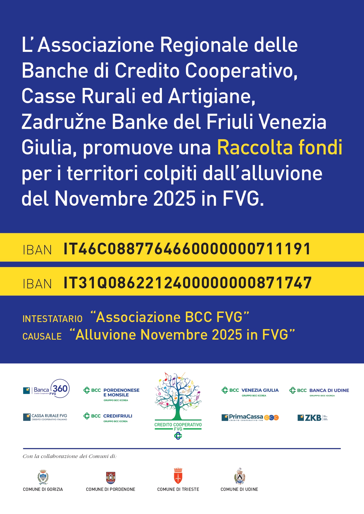 La Raccolta fondi è già attiva presso i 250 sportelli delle 8 banche di credito cooperativo sparsi sull’intero territorio della nostra regione e consente a chiunque di donare un contributo a favore di quelle aree delle province di Gorizia e di Udine che sono state colpite dalle esondazioni dei torrenti Judrio, Torre e Versa.